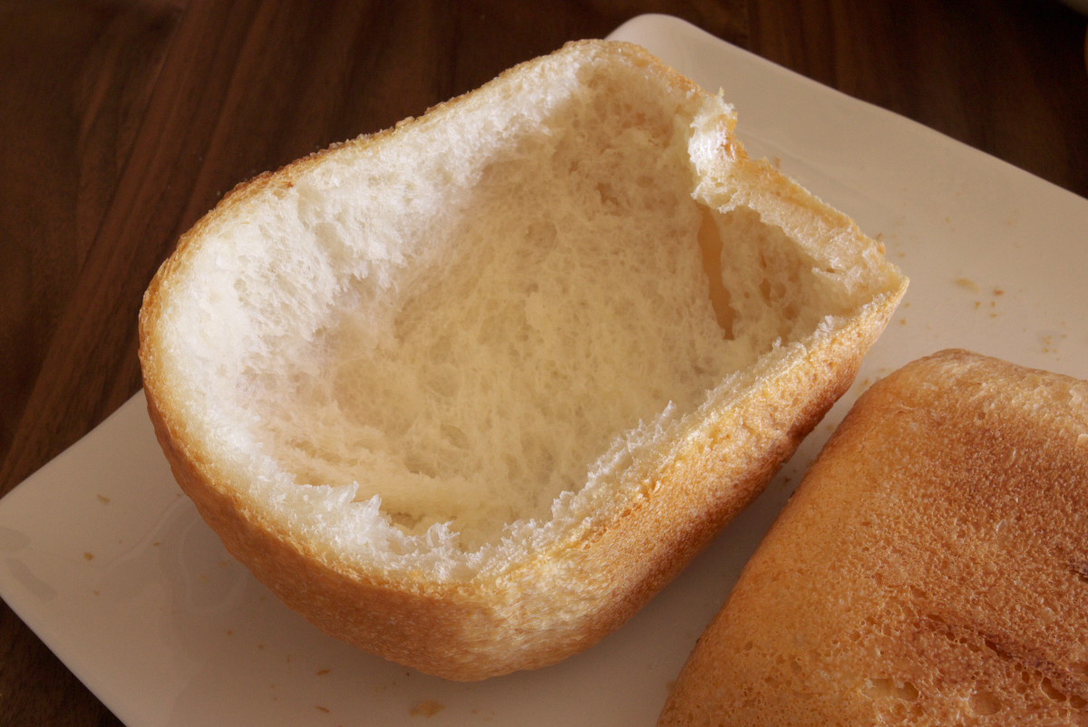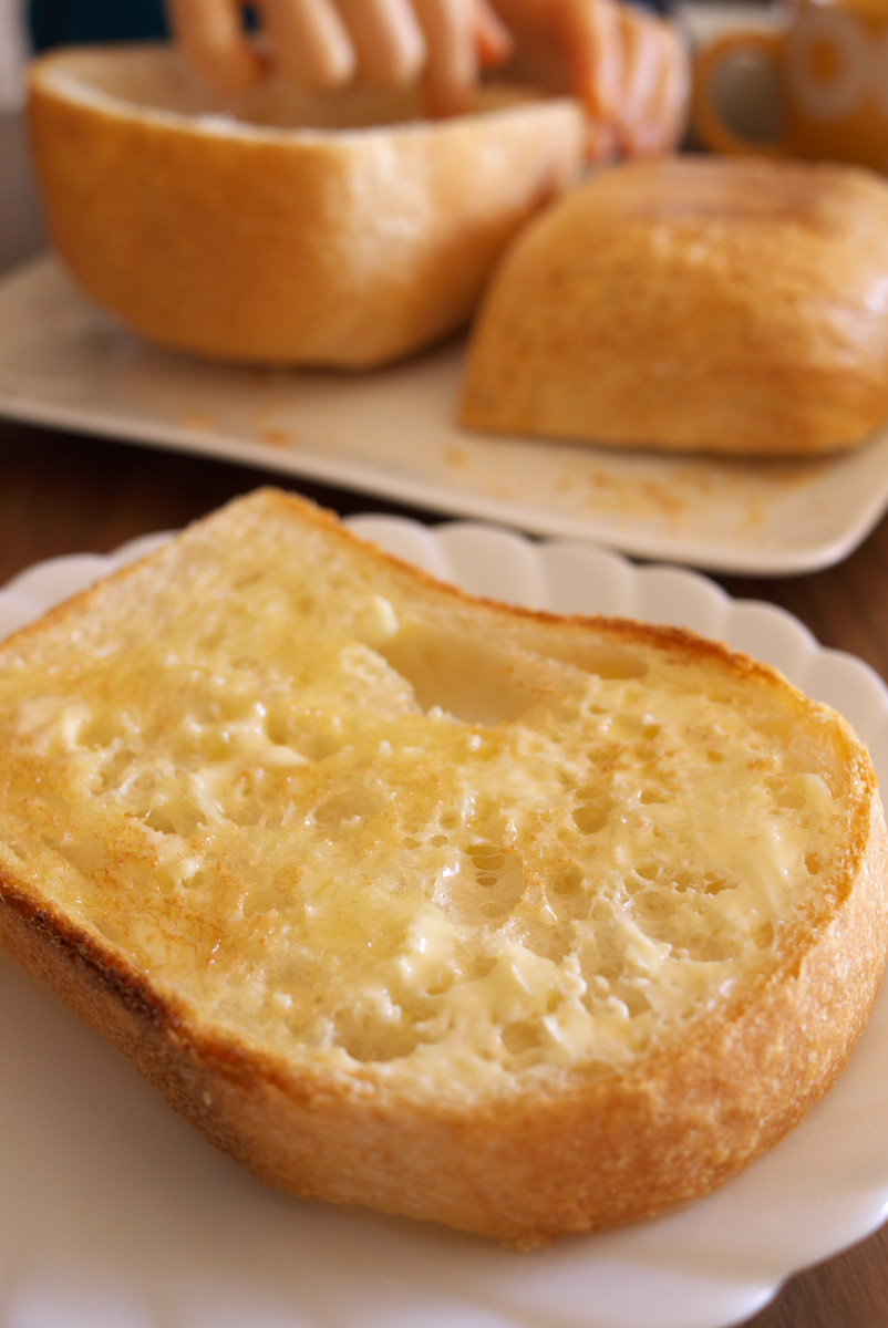 熱々のパンは柔らかくて潰れてしまうので薄く切れない。