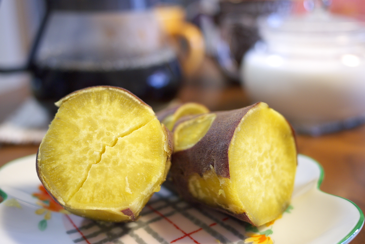 さつまいも&モンテールのどら焼き&ヨメのカフェオレ~。