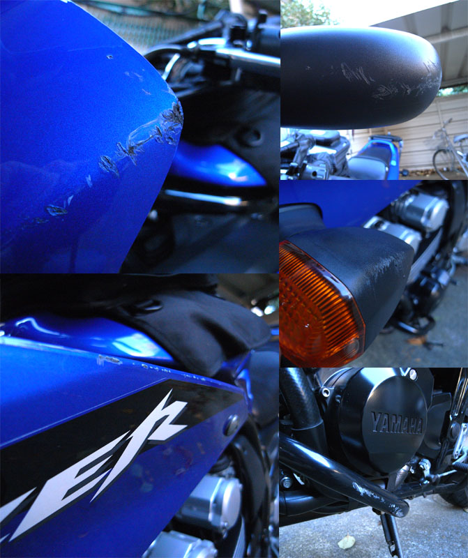 幸いエンジンガードが装着されていたためか、カウル、ミラーなどに小傷程度で済んだ。