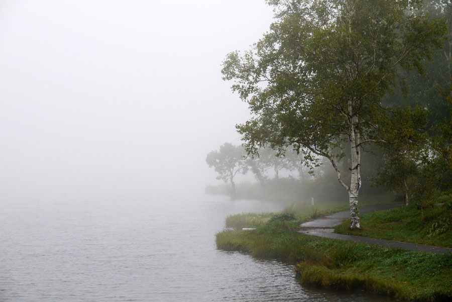霧の白樺湖です。