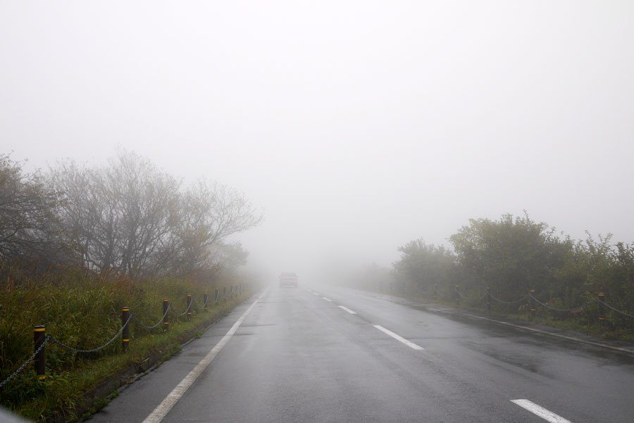 ここまで霧が濃いと30キロ程度でノロノロ運転するしかない。