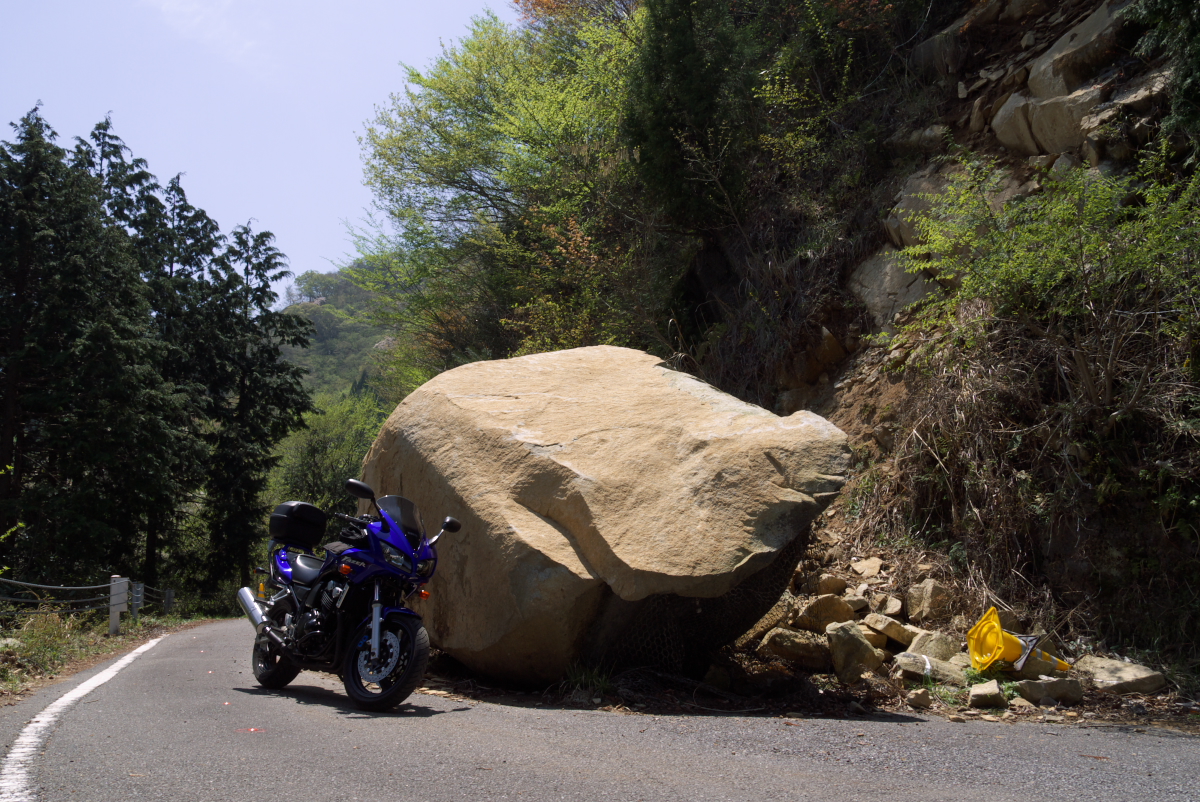 2、3m級の岩が道路を半分以上塞いでます。
