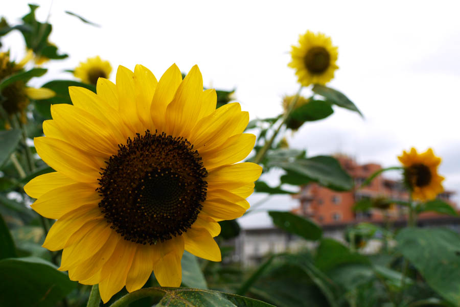 畑のひまわりでは蜂がせっせと花粉集め中。