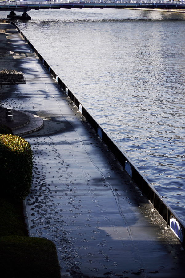 隅田川の歩道が泥でグチャグチャしている。