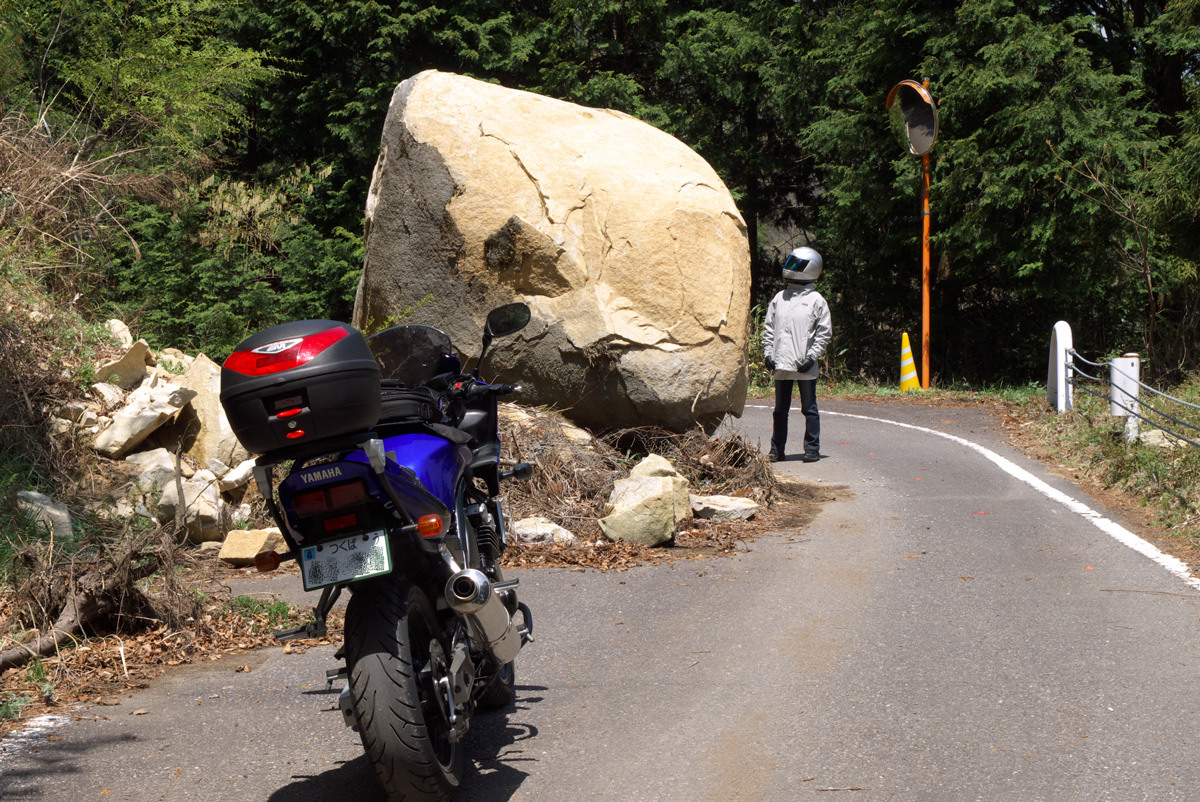 2、3m級の岩が道路を半分以上塞いでます。